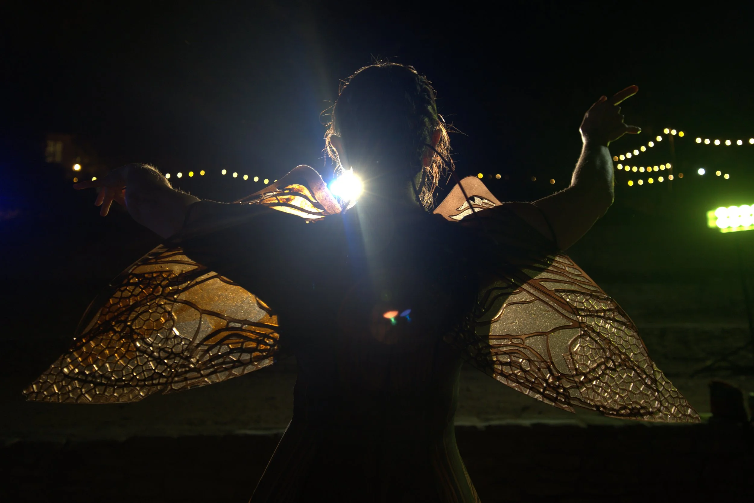 Crickets chirp by rubbing their wings together, with one wing acting as a file and the other as a scraper. The frequency and pattern of these chirps change with varying temperatures and the crickets‘ intentions. Inspired by this natural mechanism, we designed wings using a zipper and a ruler, enabling dancers to mimic the chirping of crickets. Our performance integrates Butoh dance, a practice that allows us to empty our human shell and let other beings live inside. The narrative explores the impact of light pollution on crickets, illustrating how male crickets mistakenly chirp at inappropriate times, leading to a disconnect with female crickets who are not ready to mate.